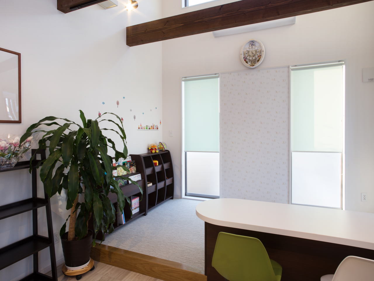 お子様が安心して治療を受けられる診察室です。ファミリールームには診療中でもお子様が遊べるように診療室の一角ににキッズマットを敷いております。ベビーカーも一緒に入れます。